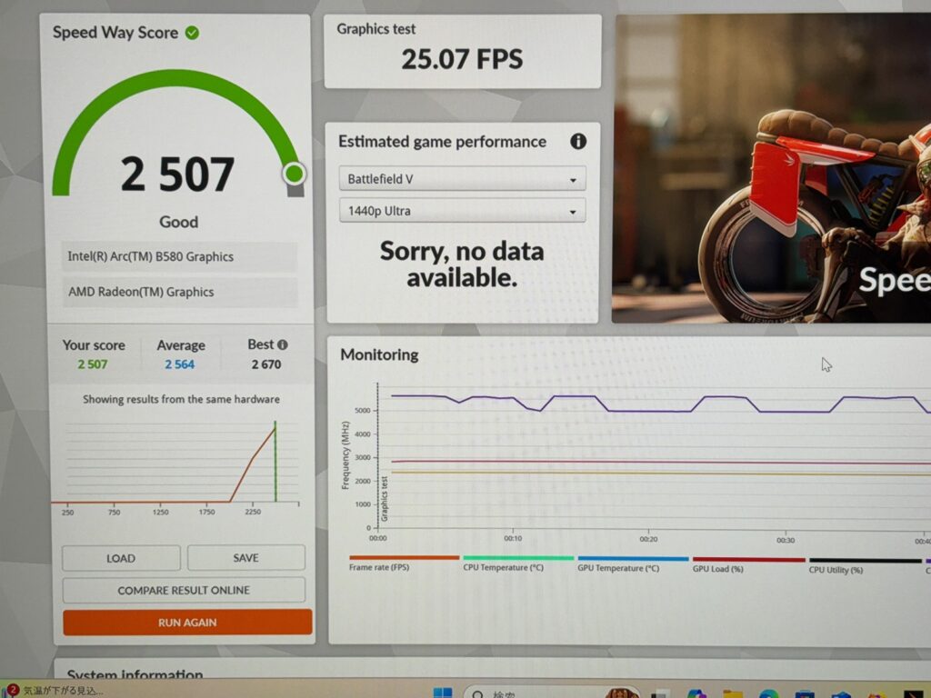発売直後はドライバがかなり不安定とか言われていましたが、ほかにも黒神話 悟空ベンチも数回走らせたところ落ちることもなく完走しましたので、ドライバの完成度も高くなってきたのかなと思われます。ただしフレームレートはお察しでしたが。