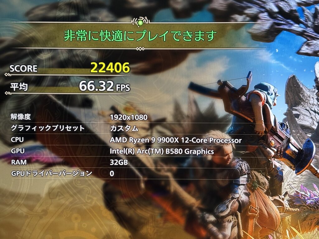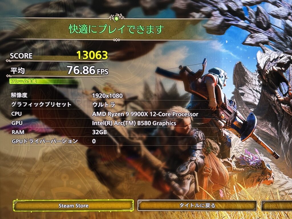 モンハンベンチもやってみました。FullHD解像度 最高設定。フレーム生成なし、レイトレなし。