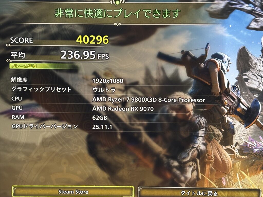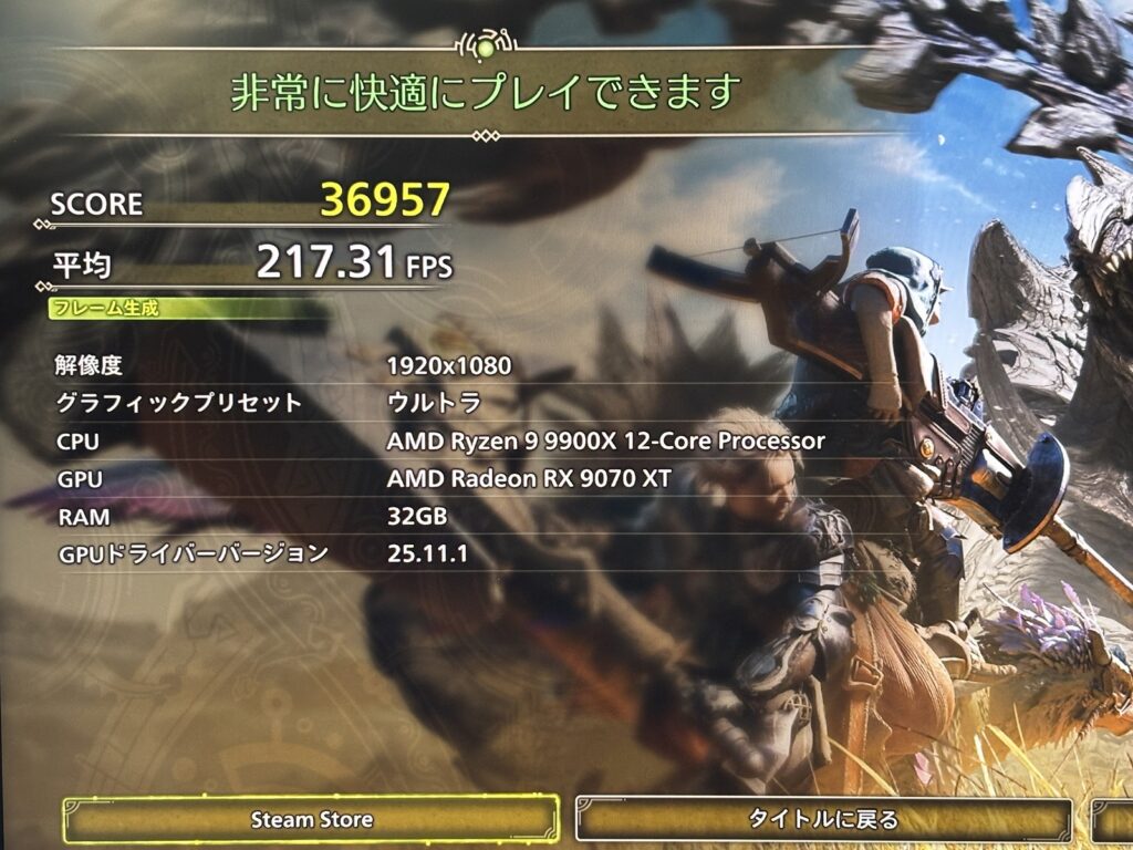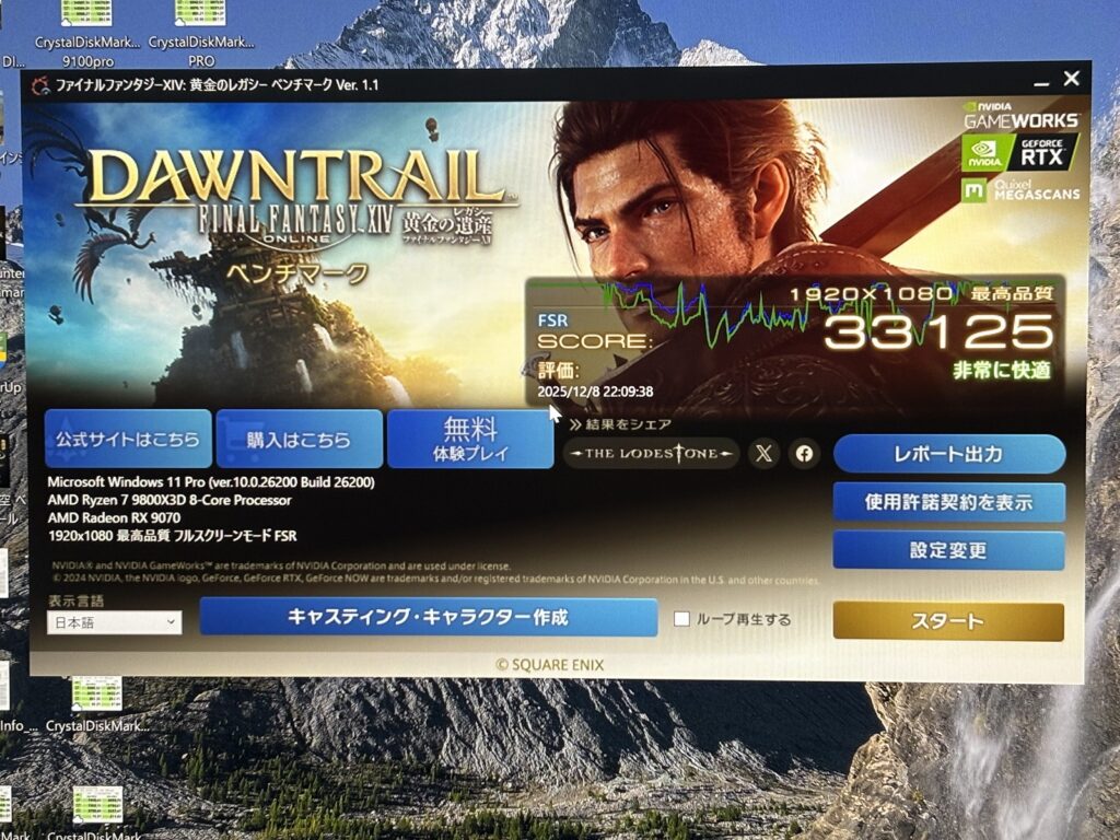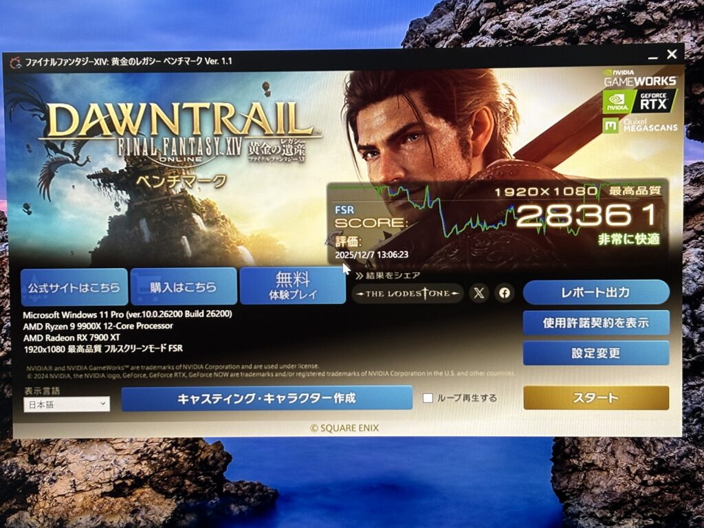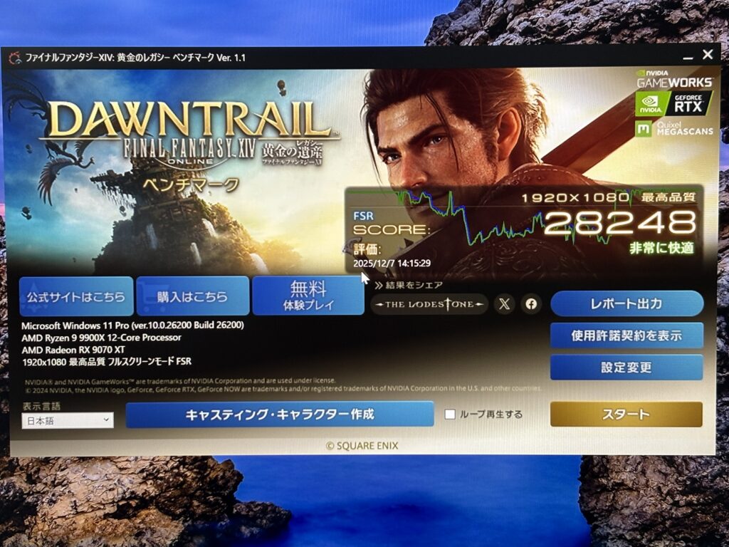 このモデルだけCPUがRyzen7 9800X3Dです。そのためFF14やモンハンベンチの数字が9070XTよりも高くなっている点に注意