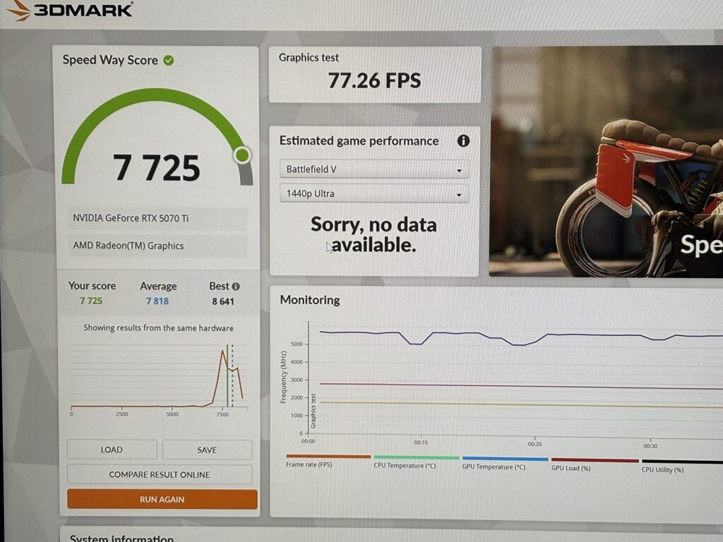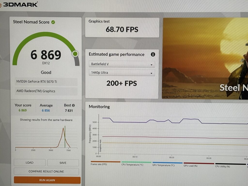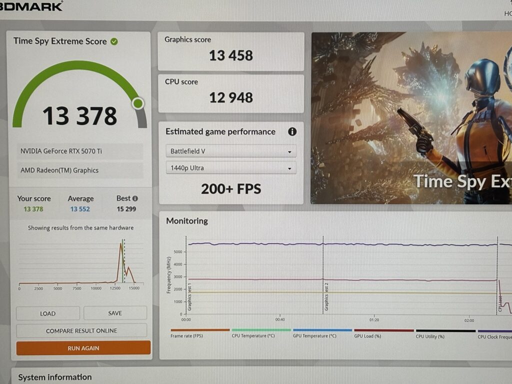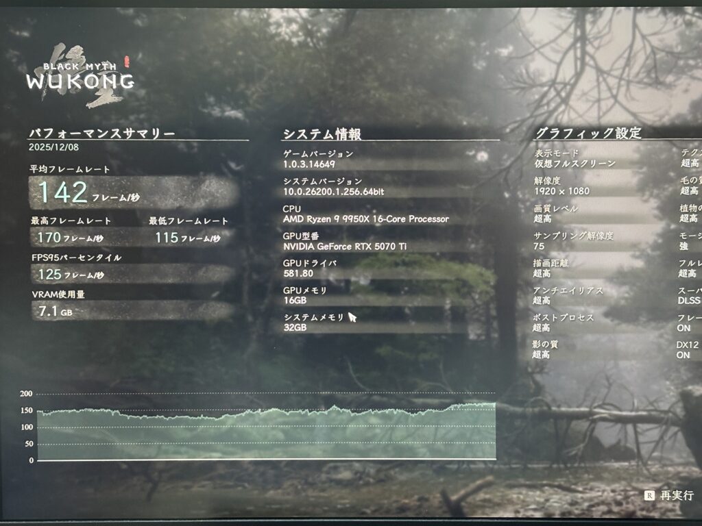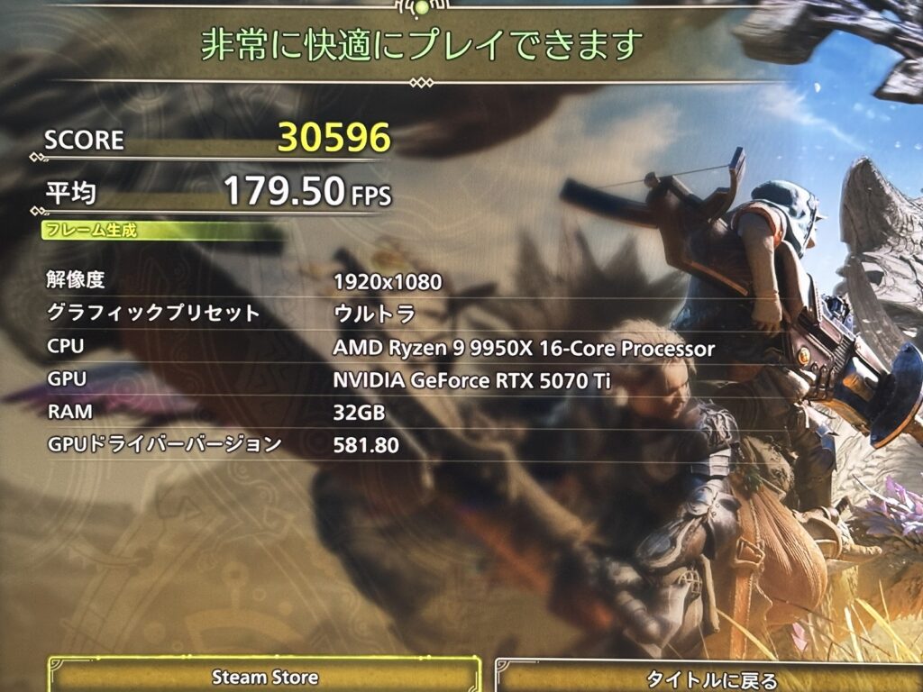 3DMarkのTIMESPYの数字がRTX5070Tiの方が高く見えますが、CPUが5070Tiは9950X、9070XTが9900Xという違いがあり、GraphicScoreの部分を見てもらえばわかるように、9070XTの方が数字的には高い値となっています。