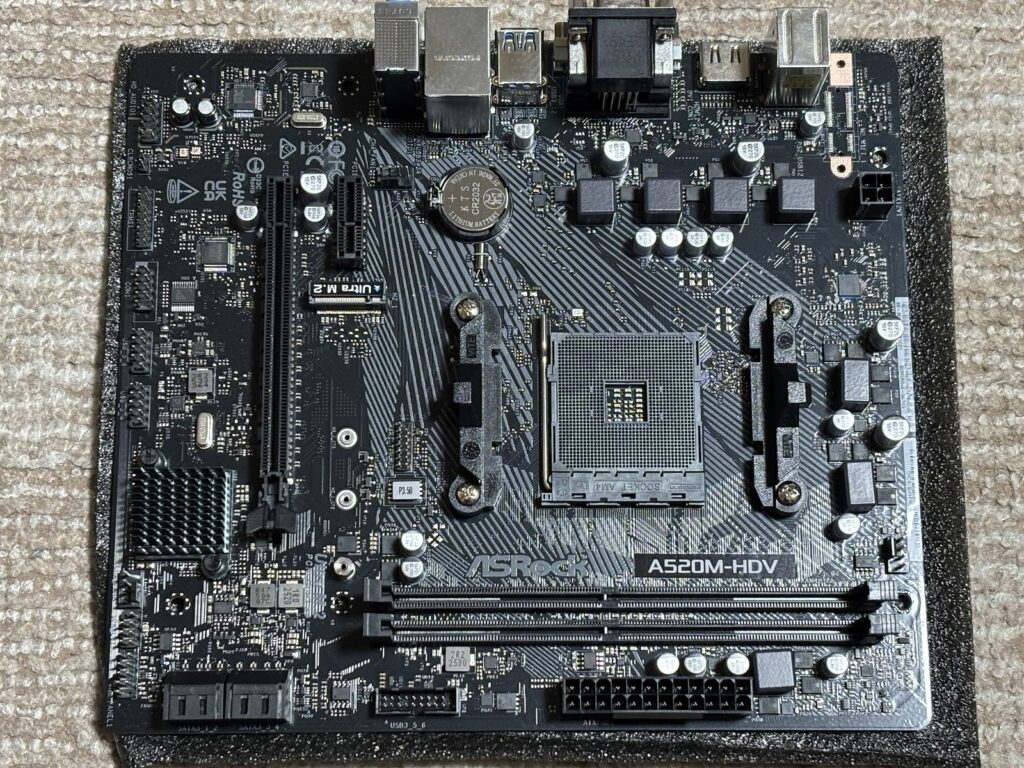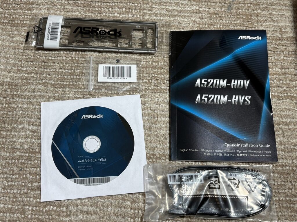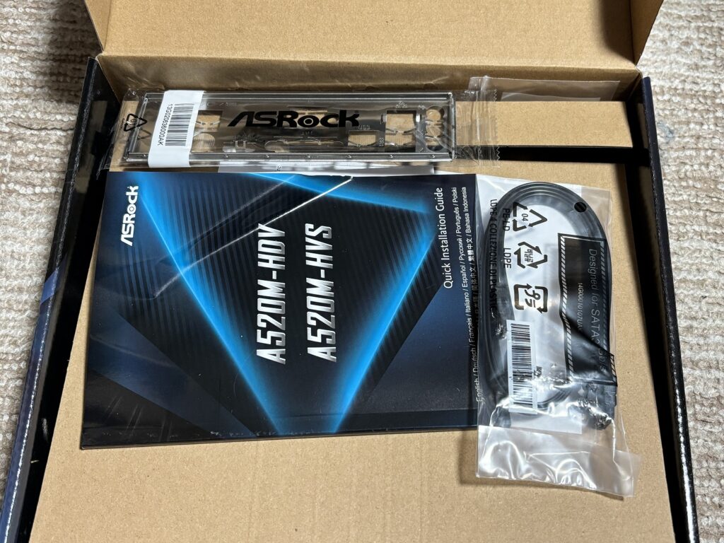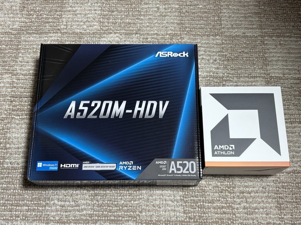 今回使用するマザーボードとCPU。マザーボードはAsrock A520M-HDVです。とにかく安価なマザーボードとなると、現状これが最強でしょう。