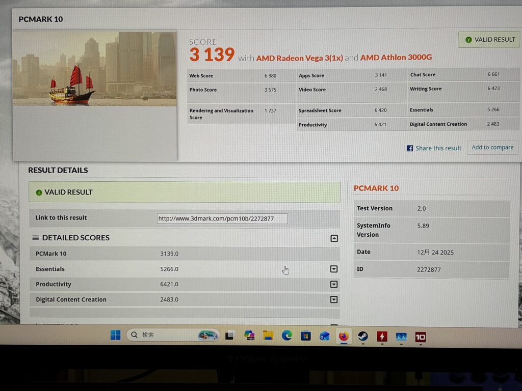 スコアは3139と出ました。ULのサイトで確認しますと、同じくAthlon3000Gの結果が出ています。だいたいやはり3000~3800くらいまで。Officeソフトをメインに使用するのがよろしいCPUです。