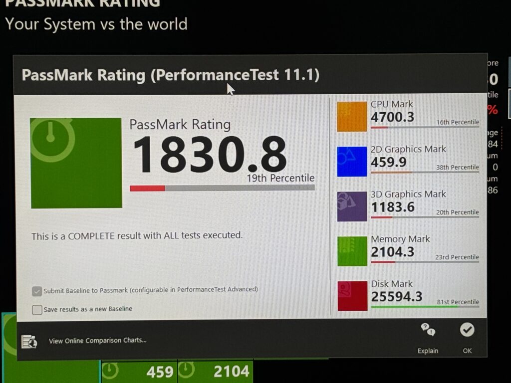 ストレージにSSDを使用しているため予想以上にストレージのスコアが高く意外な結果。CPUスコア4700とCore i5 7500Tとかと同等レベルです。